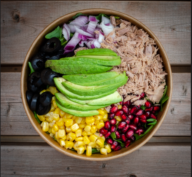 Chopped spinach and arugula, tuna, black olives, red onion, corn, pomegranate seed, avocado.