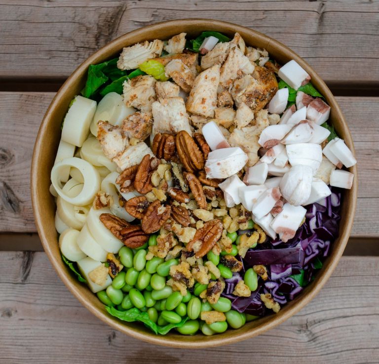 Romaine, arugula, red cabbage, chicken, mushroom, hearts of palm, pecans, walnuts, edamame.