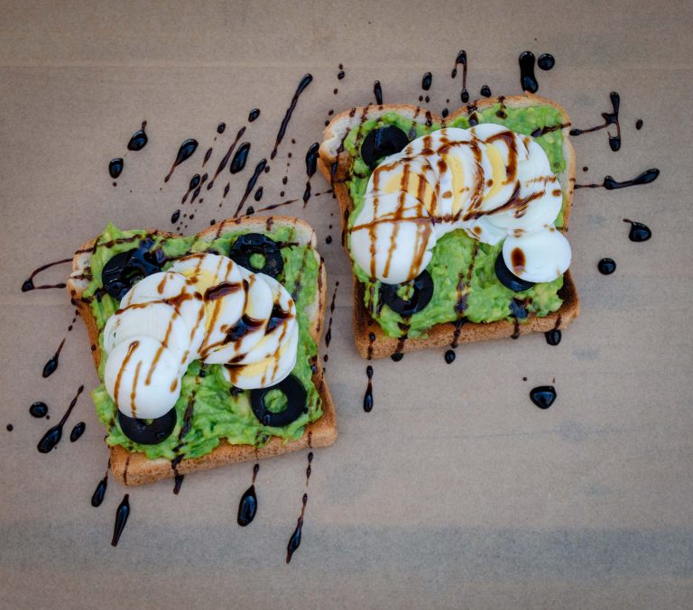 Toast, avocado, egg, olives, balsamic glaze